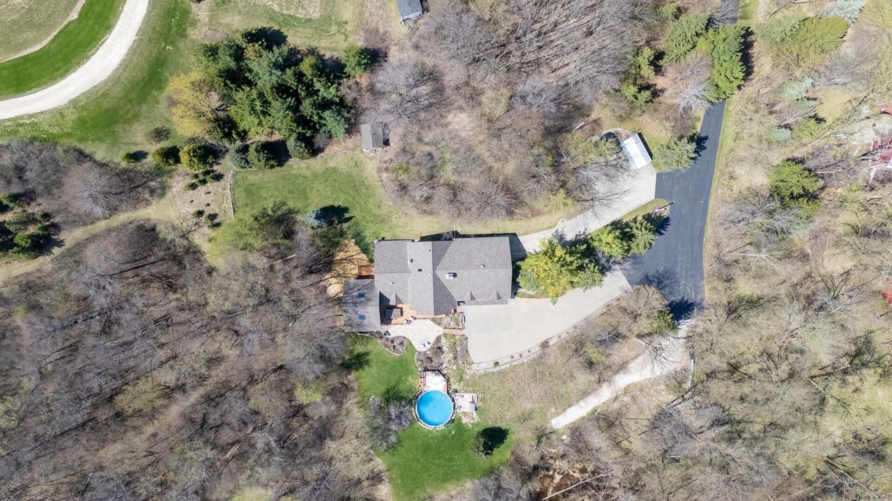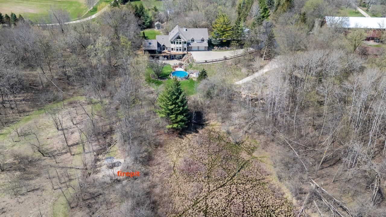 Stunning custom-built 5BR/3.5BA, 3,464+ sq ft home on 5.84 private acres in the Kewaskum School District! Features a main-level primary suite, three upper bedrooms plus office and bonus room, and a finished walk-out lower level with 5th bedroom, bar, and natural fireplace. Additional gas fireplace in the primary and natural fireplace in the living room. Interior highlights include Granite and Cambria countertops, newer appliances, and central vac. Enjoy expansive windows, plus a screened-in porch with wood cathedral ceilings, skylights, infrared heater, and remote retractable screens, along with a composite deck. 10-car garage (heated 4-car lower, 6-car upper), storage shed, and sealed driveway. Private setting with convenient highway access. A rare blend of luxury, space, and privacy!