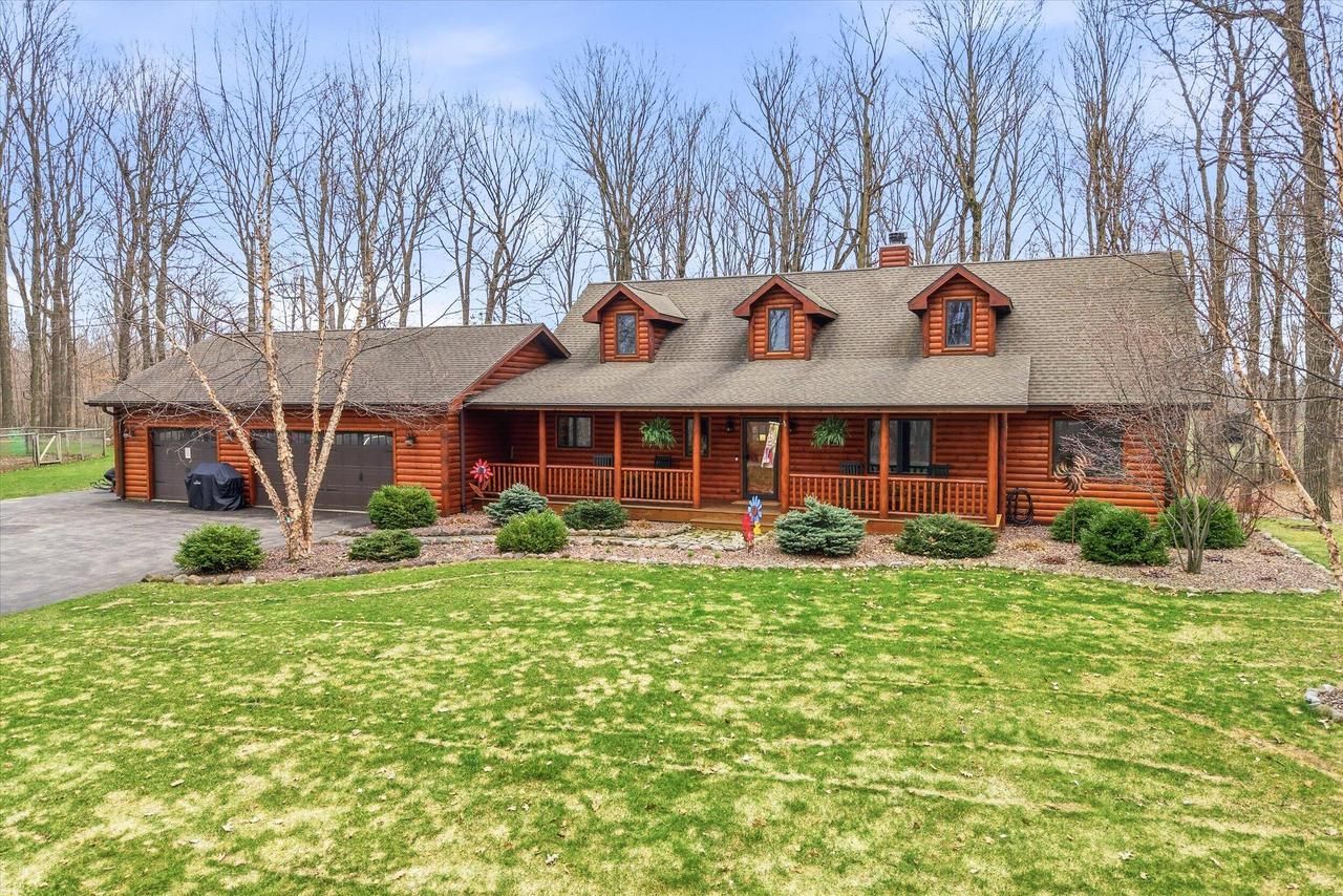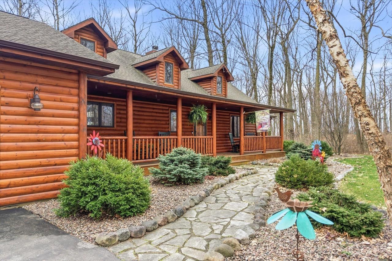 A rare Kettle Moraine beauty--this stunning log cabin rests on 5+ acres, offering a peaceful, private setting for nature lovers. With 4 BRs, 3 BAs, and 2 FP's, the home features a finished walk-out LL complete w/a bedroom, full BA, workshop with walk-out doors, and wet bar--perfect for entertaining or extended stays. The kitchen is anchored by a large island, granite CT, pantry, and abundant storage which flows seamlessly into the dining area & screened 3-season porch--ideal for morning coffee & sunrise views. The primary suite offers new HWFs w/a private BA w/dbl vanity and walk-in shower. A dramatic wall of windows fills the great room w/natural light & sweeping views. Meticulously maintained with a 3.5 car garage, 2 fire pits, solar-lit shed. A retreat designed in harmony with nature.